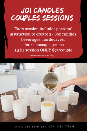 Then you need to schedule a candle making session with our owner, Janet Stephens. You will have a 2 hour session that includes learning the science of candle making, will create your own candle with the oils that are available, games, wine and light hor d'oeuvres.