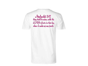 The shirts are white with hot pink foil letters that glimmer with the scripture on the back, Malachi 3:17 - "they shall be mine saith the Lord when I make up my Jewels"